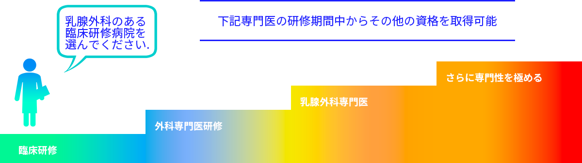 乳腺外科医は基本的に外科専門医研修および乳腺外科専門医研修を経て、それぞれの資格を取得します。